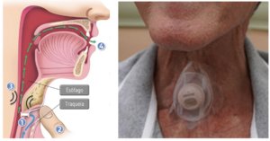 Para falar, primeiramente inspira o ar por meio da traqueostomia. A seguir, ele cobre a saída da traqueostomia com o dedo. Pela válvula, o ar é direcionado ao esôfago, fazendo- vibrar. A onda sonora é direcionada para a boca, onde a voz será formada.