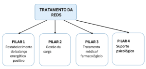 O ponto inicial é a correção do balanço energético. Em casos mais iniciais, a correção da baixa ingestão energética pode ser suficiente, sem interferir no treinamento.