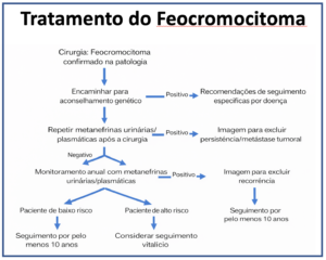 Se as metanefrinas estiverem baixas, os exames deverão ser repetidos a cada 6 a 12 meses (a depender do risco do paciente), o que deve ser feito por pelo menos 10 anos (em pacientes de baixo risco) ou por toda a vida (nos pacientes de alto risco).