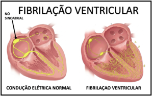 Na fibrilação ventricular, no entanto, impulsos elétricos são gerados diretamente por um tecido anômalo nos ventrículos e se espalham para o músculo cardíaco de form irregular, rápida e desordenada. O músculo passa a vibrar ao invés de bater, e perda a capacidade de bombear sangue, o que funcionalmente equivale a uma parada cardíaca.